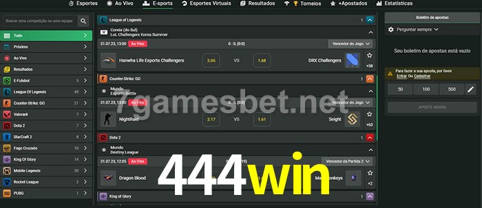 O 444win oferece uma grande seleção de opções de apostas em e-sports com probabilidades competitivas